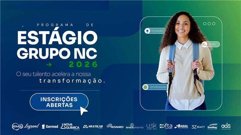 Setembro de 2025 – O Grupo NC, conglomerado com mais de 25 empresas e detentor da EMS, líder do setor farmacêutico no Brasil há 19 anos consecutivos, anuncia a abertura das inscrições para o Programa de Estágio 2026: